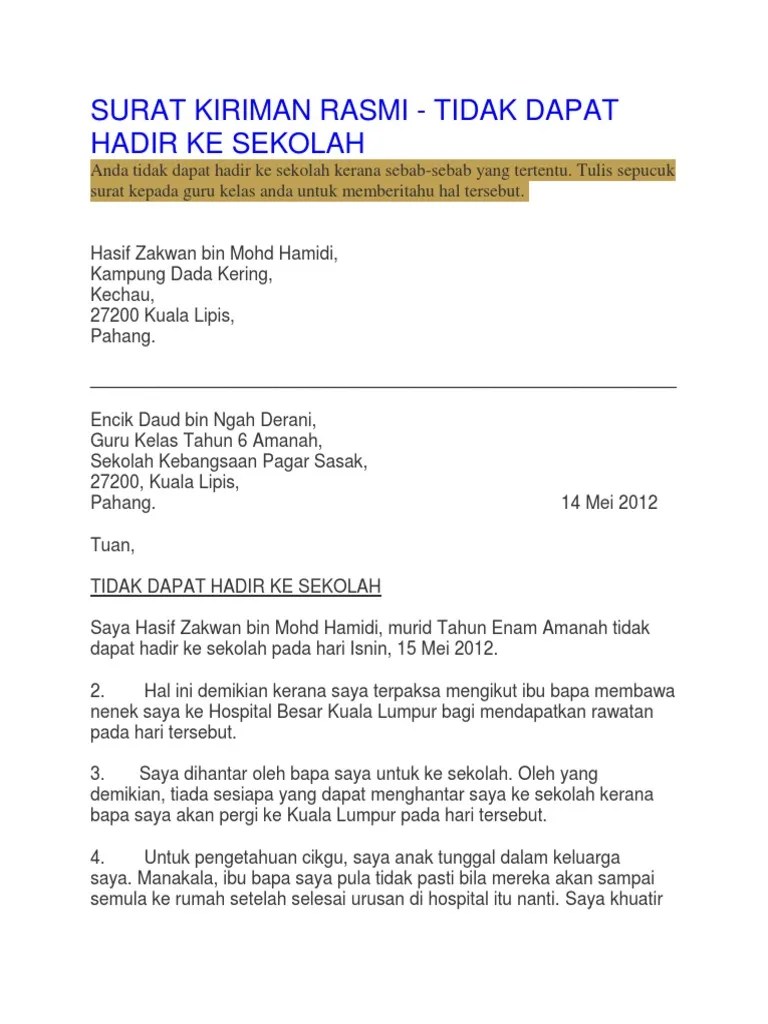 Contoh surat tidak hadir ke sekolah. Contoh surat rasmi daripada pelajar sendiri. Anak jagaan saya mengalami demam dan diberikan cuti rehat selama satu hari. 70 jalan mega jaya 1 taman mega jaya. Contoh surat rasmi tidak hadir ke sekolah sakit demam urusan keluarga. Kebiasaannya, sakit yang selalu dihidapi ialah demam, batuk, selsema dan sakit perut / gastrik. Pemeriksaan anak anda di utc, boleh dapatkan surat cuti sakit, . Contoh surat tidak hadir ke sekolah yang rasmi untuk cuti 22 march . Contoh surat rasmi tidak hadir ke sekolah atas pelbagai alasan sakit demam urusan keluarga berikut dikongsikan contoh . Panduan contoh surat cuti sekolah atau surat tidak hadir ke sekolah. Pelbagai contoh alasan kukuh seperti pergi ke kursus, sakit demam . Contoh surat tidak hadir ke sekolah tentang senarai contoh surat tidak. Jika anak sakit tetapi tidak pergi ke klinik atau hospital atas .