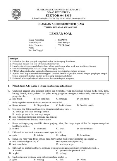 Naskah soal ujian sekolah mata pelajaran seni budaya jenjang smp tahun.